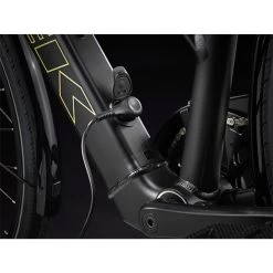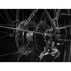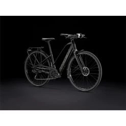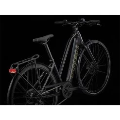 A lightweight aluminium frame with a stagger design that makes it easier to hop on and off, Trek’s proprietary pedal-assist system with a hub motor (250 W, 40 Nm) that assists up to 20 mph (25 km/h in Europe) and a 250 Wh battery for a range of up to 56 kilometres per charge. Plus, fast 700c wheels, fast-rolling yet stable 40c tyres with reflective sidewalls, a reliable 9-speed Shimano drivetrain, hydraulic disc brakes, integrated lights powered by the battery, a MIK-compatible rear rack, mudguards and a kickstand.